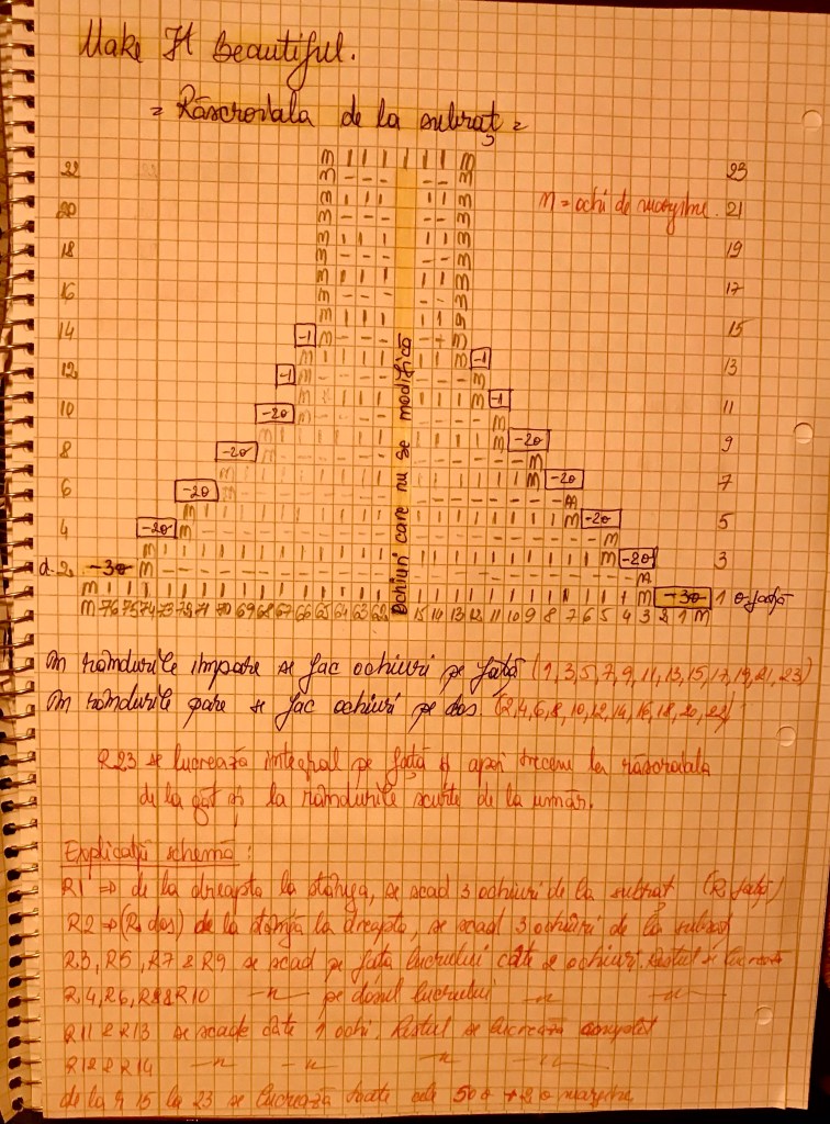 R14 (RD): se închide 1 ochi și se lucrează ochiuri pe dos pana la final; întoarcem lucrul