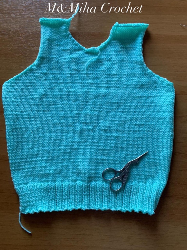 🪡 S-a făcut rascroiala de la subraț și apoi rascroiala de la gât, cu rânduri scurte.