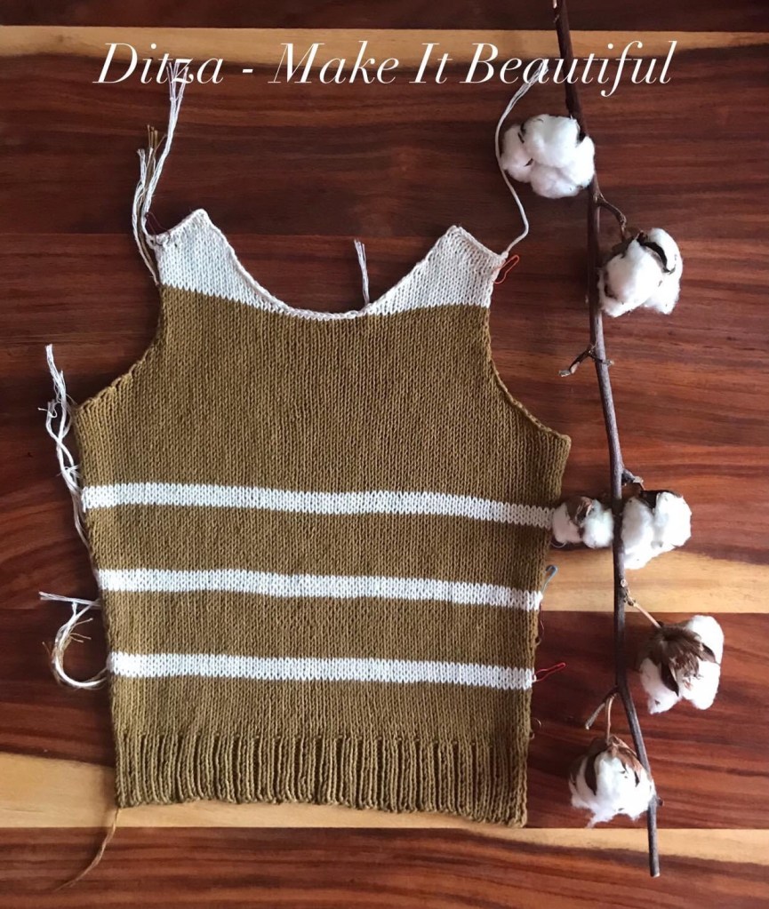 Pentru banda de jos, am cules ochiuri din lucru și am lucrat elastic 2×2 pentru 3,5 cm, încheind cu punct Picot tricotat.