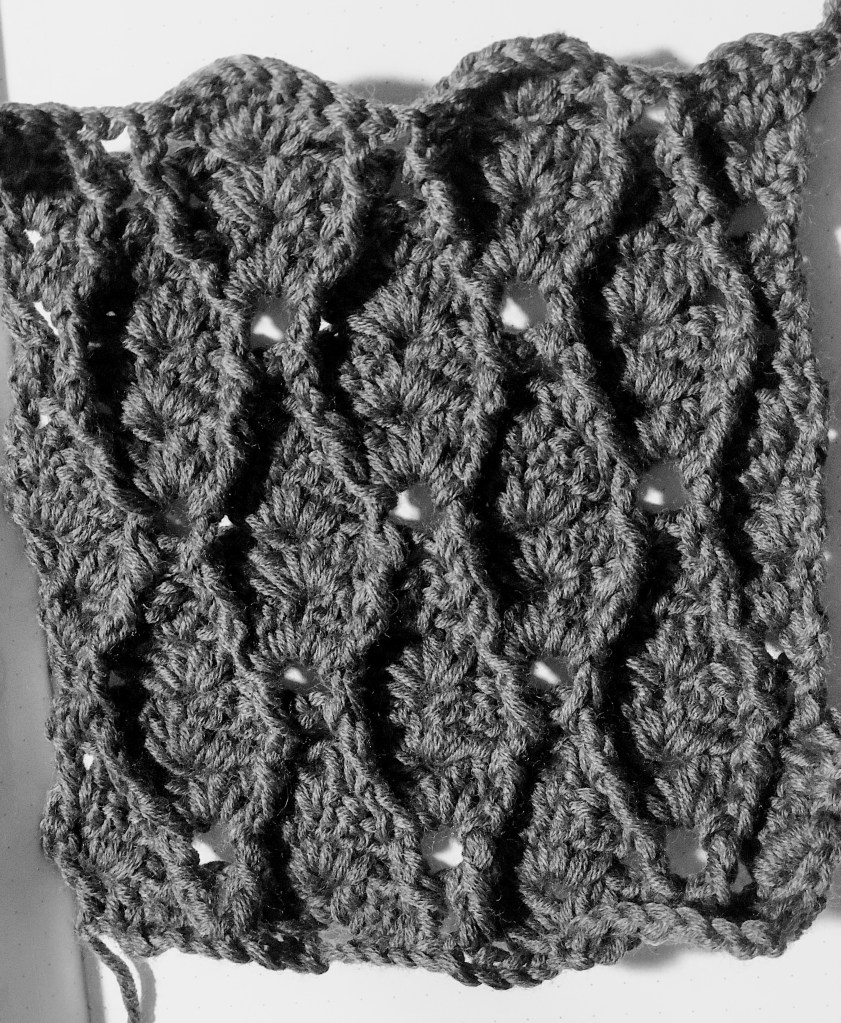 *(Skip 3 sts and in the 4th st work 3 dc, ch1, 3 dc. Skip 3 sts and in the 4th st, make 1 dc, ch 1, skip one st , make 1 dc)* repeat till you will have 4 sts; work 3 dc in the 3rd st, ch 1 and work a dc in the last st. Ch 1 turn your work
